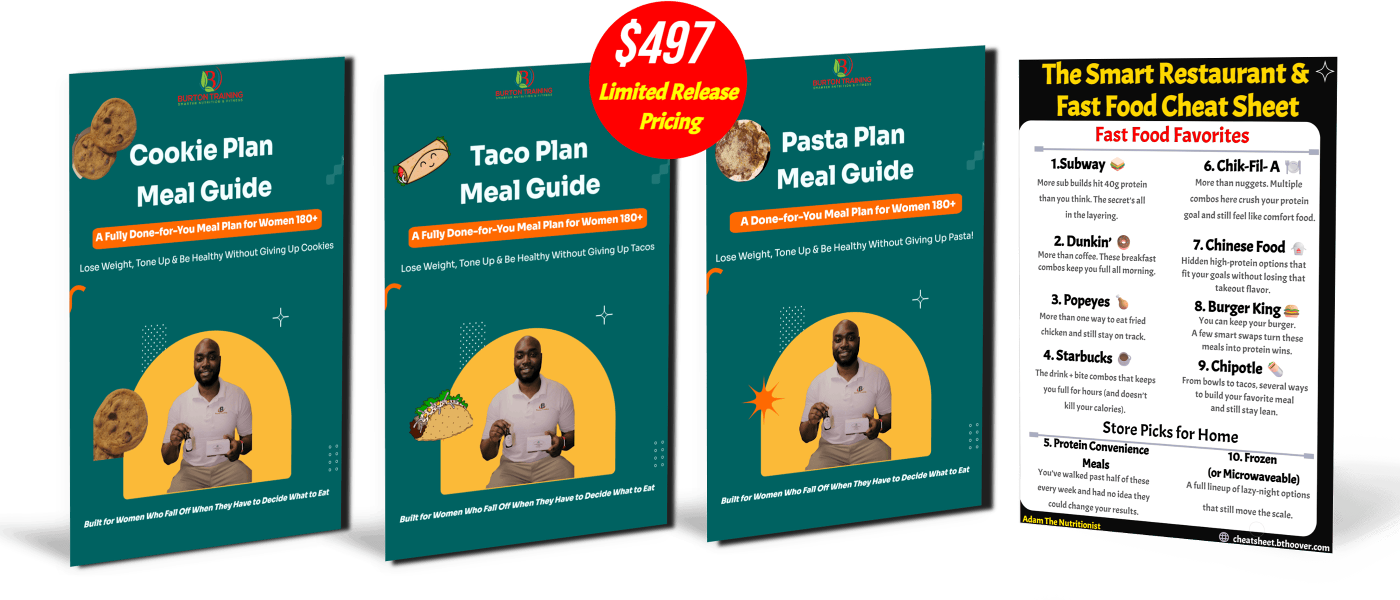 • 5 Done-For-You Meal Plans (Cookies, Wings, Pasta, Tacos + Wildcard)  → You’ll know exactly what to eat every day without tracking or guessing.